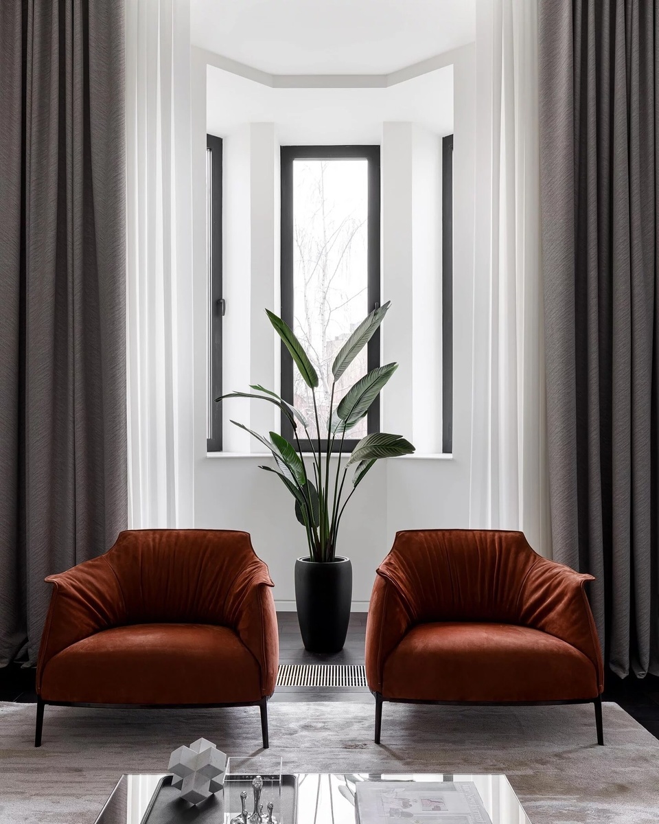 Вдохновением для проекта в авторском доме «Roza Rossa» послужил элегантный минимализм, где черный, белый и графитовые оттенки гармонично сочетаются с яркими терракотовыми деталями.