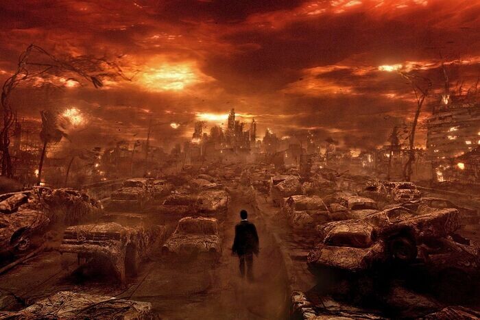 То, что он видел, было похоже на ад из одного старого фильма. Улицы забиты сгоревшими машинами, в воздухе висела пыль, окрашивающая свет солнца в красный свет, непрерывно дул ветер. Немногие уцелевшие деревья были черными или горели, была черной земля под ногами. Везде лежали тела людей, черные, как и все остальное.