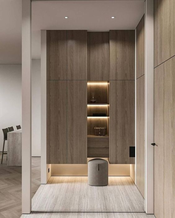 Ранее мы уже обсуждали, что при планировании прихожей первым делом нужно подумать: какие вещи мы в принципе планируем размещать. Кто-то перед выходом из года в год использует один и тот же парфюм, а у кого-то может быть целая полка наравне с магазином. И, повторюсь, об этом нужно думать заранее. Давайте пробежимся по списку самых распространенных вещей, которые живут в прихожей: 2. Одежда 3. Обувь 4. Сумки 5. Прочее Для удобного хранения детской коляски в шкафу необходимо предусмотреть глубину шкафа минимум 63-65 см, что больше стандартного размера. Это позволит разместить ее без проблем. Шкаф должен быть без цокольной части, чтобы можно было легко доставать и ставить коляску. Фасады опущены почти до пола с небольшим техническим зазором. Ну и из простого - обыгрываем декоративно, например, картиной с широким багетом Если вы хотите получить совет по организации хранения вещей в вашей прихожей, присылайте фото в мой телеграмм канал на разбор. INTERA для Вас. Про Вас. Изображения были