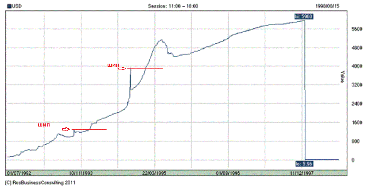 Процесс роста курса доллара практически ни чем не отличается до 1998. Шип ...резкая девальвация, далее длительная проторговка, но всегда с одной и той же целью, пробой шипа и уход в новые ценовые коридоры. Сейчас такая же история, шип на 154 и все будет стремится к тому что бы и дальше обесценивать рубль. Сейчас все для этого, ОФЗ провальные размещения, одно за другим. Длительное удержание высокой ставки, никогда депозиты не обгонят девальвацию. Загон населения в депозиты для того, что бы их просто там обесценить при помощи девальвации. Продолжаем по плану Кстати, через юань девальвация будет сильнее, чем, через доллар, Там и шип на много выше, на 23. Телеграмм