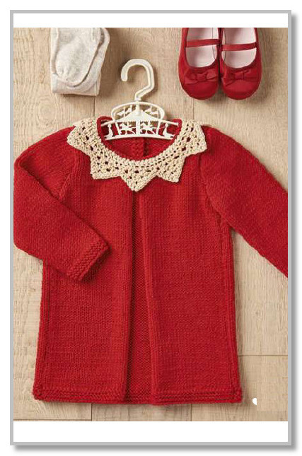 Обвязка горловины: приколите воротник вокруг выреза. На спицы № 4.5 с лицевой стороны красной пряжей набрать через оба слоя (платья и воротника) 15 (15: 16: 16: 17) п. по левой стороне выреза спинки, 26 (26: 30: 30: 34) п. по горловине переда, 15 (15: 16: 16: 17) п. по правой стороне выреза спинки = 56 (56: 62: 62: 68) п. Закрытый в следующем ряду как изн.