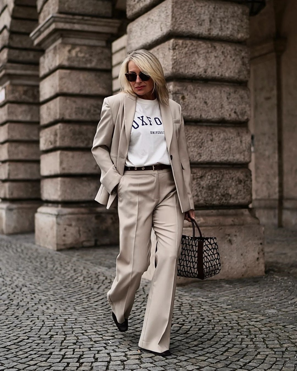 Например, более расслабленный крой, цвета поярче, обувь посмелее или составить классический образ по всем канонам, но прихватить трендовую сумку.