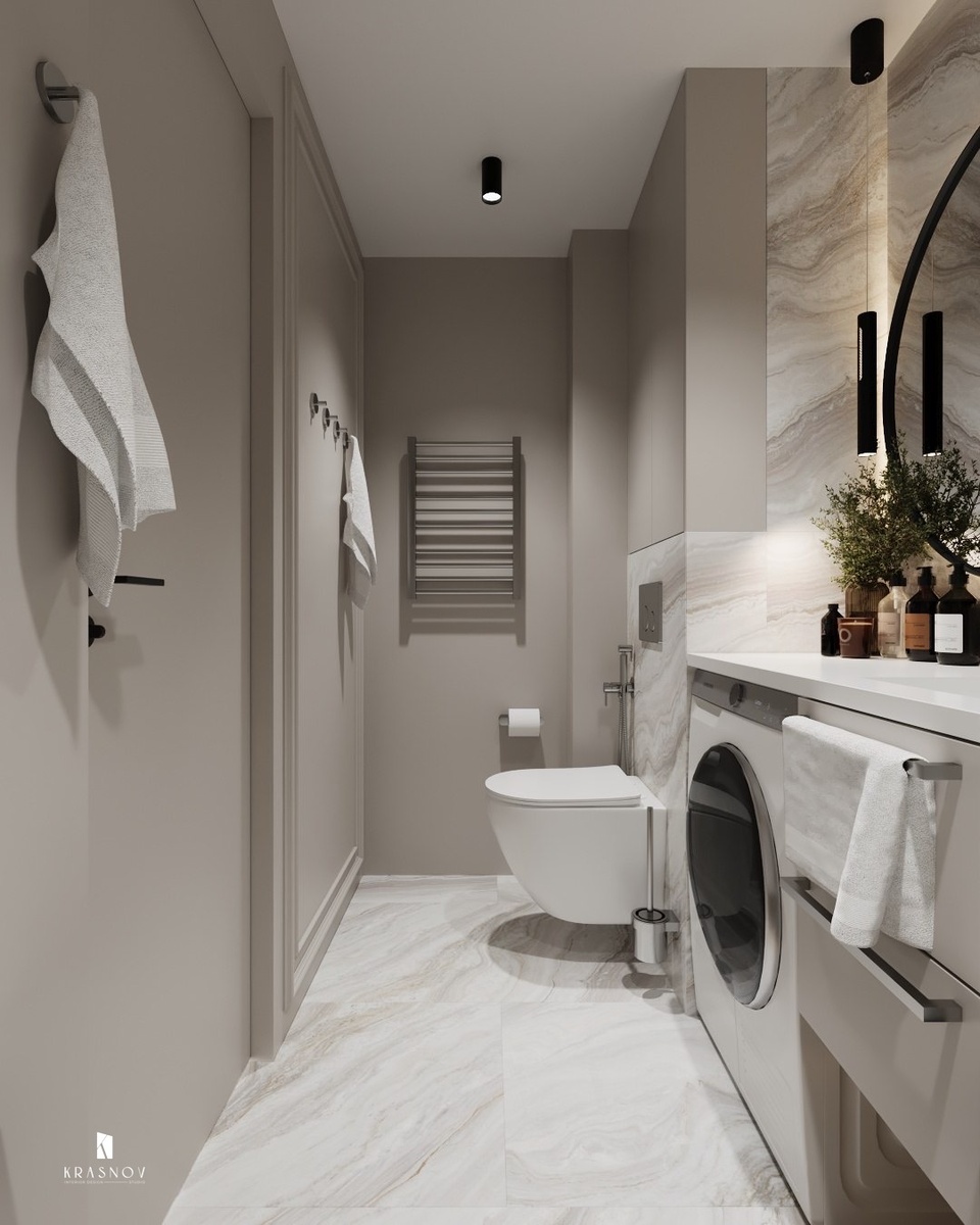 Также скрытая подсветка разместилась и в зоне ванной, где она подчеркивает фактуру акцентного керамогранита.