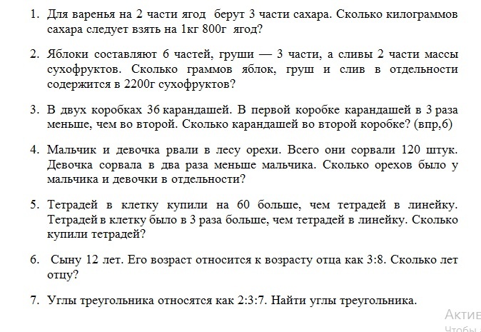 Сегодня разбираем арифметический способ решения подобных задач В первых двух задачах в тексте присутствует слово "части", т.е. указан вид задач. Как их решать? Во-первых, перед решением любой задачи лучше сделать схему для решения. Задача 1 "Правильная" схема - половина решения задачи 1) Узнаем, сколько грамм (ягод или сахара) приходится на одну часть Для этого 1800 : 2 = 900 (г) 2) Узнаем, сколько сахара следует взять, т.е. 900*3=2700(г) 3) Запишем найденное число в кг : 2700 г=2,7 кг Ответ: 2,7 кг Задача 3 И где же здесь "части"? В условии читаем "В первой коробке в три раза меньше карандашей, чем во второй". Если примем число карандашей в первой коробке за одну часть, тогда число карандашей во второй коробке равно трём частям! Из схемы "видим", что 36 карандашей составляют 4 части Ответ: во второй коробке 27 карандашей Задача 6 В шестом классе изучается тема "Отношения" 3:8 это отношение двух чисел, то есть другими словами: на первое число "приходится" три части, а на второе восемь