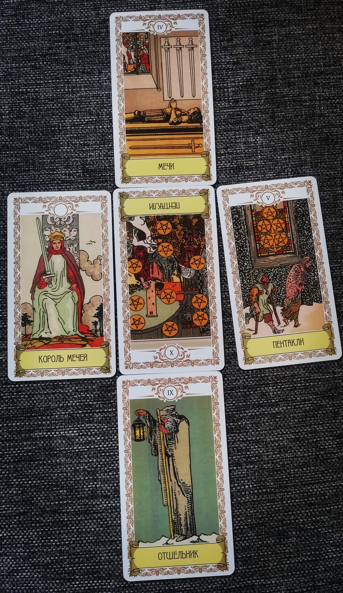 Этот расклад ясно показывает, что вы находитесь в сложной ситуации, требующей как внутренней работы, так и внешних изменений. Перевёрнутая Десятка Пентаклей указывает на нестабильность, которая может быть вызвана материальными или семейными вопросами. Король Мечей призывает вас проявить логику и рациональность, чтобы справиться с проблемами. Пятёрка Пентаклей напоминает, что даже в трудные времена всегда есть помощь и поддержка, нужно только обратить на них внимание. Отшельник предлагает погрузиться в самоанализ и найти ответы внутри себя, а Четвёрка Мечей советует не торопиться, а сначала восстановить силы.