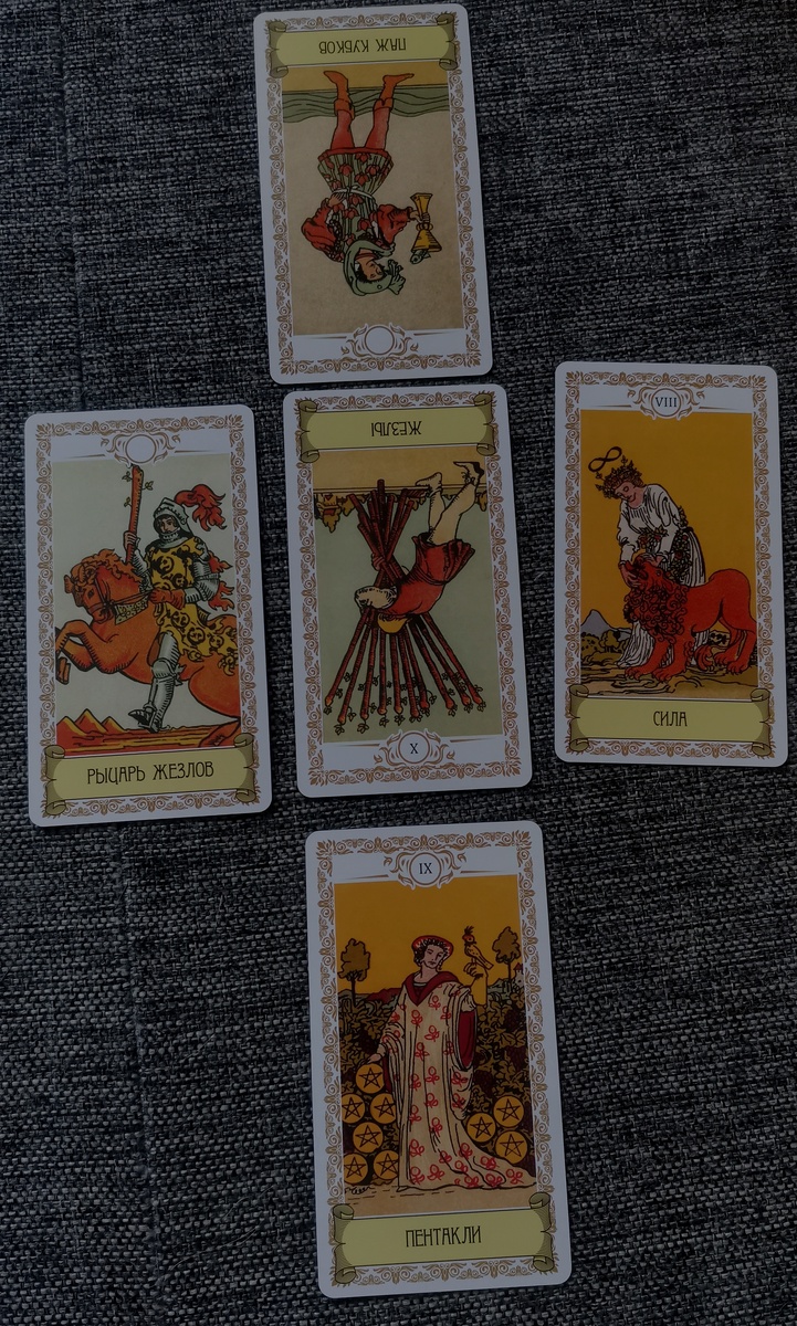 Расклад «Внутренние Архетипы» помогает вам глубже понять, какие внутренние силы и роли действуют в вашей жизни прямо сейчас. Перевёрнутая Десятка Жезлов указывает на необходимость освободиться от перегрузки, Рыцарь Жезлов активирует внутреннего Воина, готового к новым действиям. Карта Сила говорит о вашей способности справляться с вызовами через внутреннюю мудрость, а Девятка Пентаклей напоминает о важности наслаждаться своими достижениями и уверенностью в себе. Перевернутый Паж Пентаклей указывает на необходимость обучения и дальнейшего личностного роста.