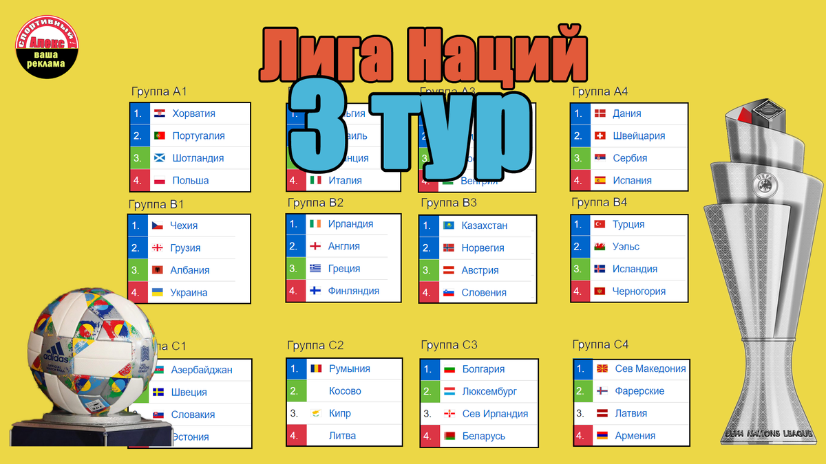 Футбол. Лига Наций УЕФА. 3 тур. Результаты 12 октября. Расписание, таблицы.