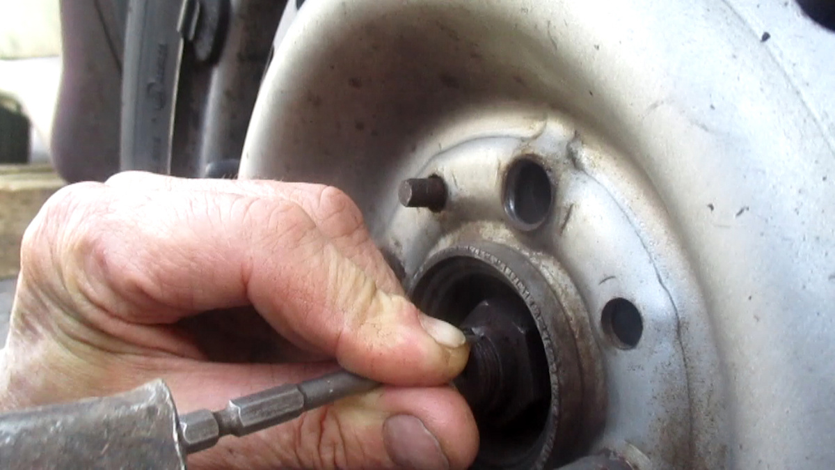 Срываем болты крепления колеса, отгибаем загиб буртика на гайке ШРУС. Ставим авто на ручник, под заднее колесо подкладываем башмаки. Большой головкой на 30, в нашем случае это усиленная специально для этих целей головка. Срываем гайку ШРУС.