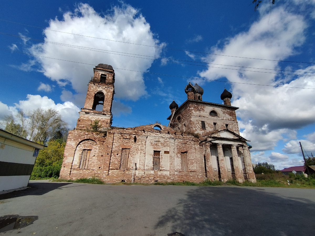 Хотя, не такой уж он и заброшенный... На просторах интернета наткнулась на фотографии этого храма. Поставила метку на карте. Мой путь проходил недалеко от села Галкинское - решено было свернуть и посмотреть заброшенный храм. Село Галкинское довольно большое. Здесь есть вполне приличный магазин и даже кафе (которое не работало, когда мы приехали, но оно есть). Храм, по меркам этого села огромный. Только оказался он не совсем заброшенным. Припарковались мы на площади у магазинчика и кафе. Хороший асфальт, у магазинчика клумбы и доска информации. У храма оказались наглухо заколочены все двери и окна, так что попасть внутрь не представлялось возможным. Первый храм в с. Галкинское был деревянным во имя Воскресения Господня. Когда деревянный храм обветшал, было решено заложить новый каменный храм. Строительство началось в 1800 году. Храм был двухэтажным, с двумя престолами. Но еще во время строительства, из-за ошибок проектирования, не учитывающих слабость грунта, по стенам пошли трещины, а