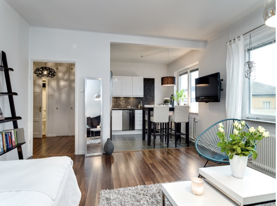 По возможности планировку стоит рисовать так, чтобы естественный свет проникал даже в прихожую. Если у вас не новостройка и радикальная перепланировка невозможна, увеличить объем света все равно реально – достаточно убрать притолоку дверного проема в кухню или заменить ее фрамугой со стеклом, установить двери со стеклом в гостиную.