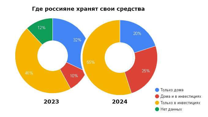 Как минимум, на 24%. Согласно исследованиям агентства «Прайм», доля людей, предпочитающих хранить все сбережения дома в этом году уменьшилась с 32% до 20% сравнительно с данными за 2023 Отмечается, что это самый низкий уровень за последние 10 лет.. Соответственно, стало больше тех, кто вкладывает деньги в инвестирование 80% вместо 56% год назад. // В этом месте можно написать, что при таких привлекательных ставках за облигации и депозиты сложно подобрать более удачное время для начала инвестирования. Но все же еще каждый пятый житель России еще хранит деньги «под матрасом».