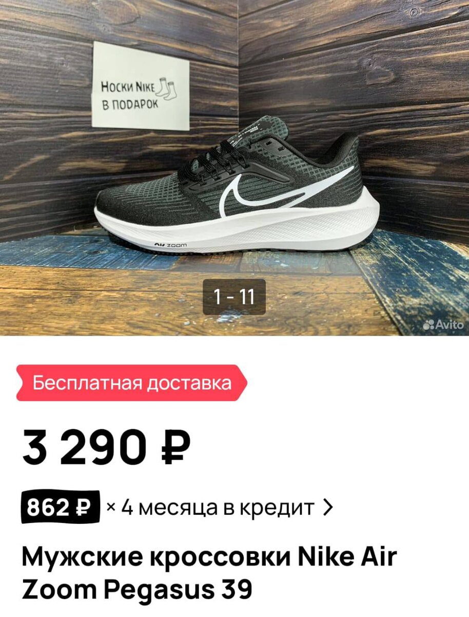 Приветствую спортсменов и спортсменок, а также всех друзья! 👋 Часто мне попадаются подобные объявления, когда я исследую различные интернет-торговые площадки! Почему бы нам с вами не обсудить это? Поэтому устраивайтесь удобнее... начнем! 😉 Что касается меня лично, я предпочитаю покупать свою экипировку в надежных магазинах и местах, как правило, это европейские магазины! И хорошие, вернее популярные товары всегда стоят недешево. Конечно, существуют скидки 15–20% на рождество, "Черную пятницу" или, например, на последнюю пару кроссовок. Но цены не опускаются ниже определенного уровня! И вот здесь нам предлагают купить Nike Pegasus 39 за 3290 рублей с бесплатной доставкой, а также получить бонусом фирменные носочки Nike... 🔥 Давайте с вами прикинем примерную закупочную стоимость этих замечательных кроссовок? Вычтем из 3290 рублей затраты на доставку продавцу (скажем, 500 рублей), его прибыль (1000 рублей), стоимость носков в подарок (500 рублей) и бесплатную доставку для покупа