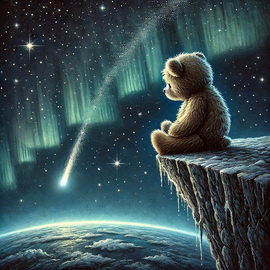 На самом краю Земли сидел одинокий мишка. Он свесил свои маленькие плюшевые лапки с края планеты, запрокинул голову, рассматривая небосвод густо усыпанный звёздами. Там наверху, в непостижимых глубинах, протекала своя недосягаемая жизнь. В эти моменты он пытался понять - кому и зачем подмигивают звезды. А когда мимо него пролетала маленькая звездочка начинал радостно болтать лапками и звонко смеяться. Мишка не старался их поймать, хоть они и пролетали иногда совсем близко. Ведь в погоне за падающей звездой можно было потерять равновесие и... Антропка, так звали медвежонка, был очень осмотрителен. Он понимал, что если он упадёт то уже совсем-совсем и навсегда останется один. Там в чёрной межзвездной пустоте он превратиться в льдинку, которую уже ни кто и ни когда не сможет отогреть. Медвежонок Антропка последнее время приходил на край земли и ждал северное сияние, к сожалению оно бывало не часто, а когда небосвод взрывался разноцветными всполохами он забывал о своём одиночестве. Он мысл