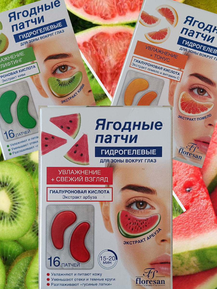 Я так хочу,чтобы лето не кончалось,чтоб оно за мной мчалось... Как говорится "хотеть не вредно,вредно не хотеть". Заглянула на огонёк в Fix Price за губками для посуды(только там в последнее время беру).Стою на кассе,глазами валяю туда-сюда и вижу симпапуличные коробочки с надписью "Ягодные патчи".Не удержалась,взяла все три вида. Но а как же, если обещают увлажнить, попитать,уменьшить,разгладить.Просто магия слов. Ягодные патчи гидрогелевые для зоны вокруг глаз с экстрактом киви.Увлажнение+лифтинг.Много чего понаписано на обороте коробки,много чего наобещено,но вот это-уже после первой процедуры патчи устраняют морщины,меня шибко удивило. Ягодные патчи гидрогелевые для зоны вокруг глаз с экстрактом арбуза.Увлажнение+свежий взгляд.И такое же обещание-после первой процедуры уменьшат отёки. Ягодные патчи гидрогелевые для зоны вокруг глаз с экстрактом помело.Увлажнение+тонус.То- же самое,после первой процедуры морщины исчезнут. Я не стала медлить