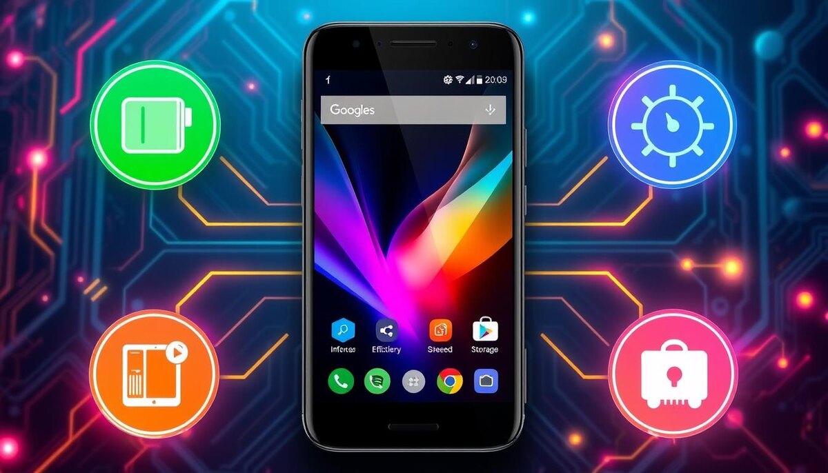 Элегантный современный Android-смартфон, окруженный яркими значками, представляющими инструменты оптимизации, такие как эффективность работы от батареи, повышение скорости и управление хранилищем, на фоне технологических схем и светящихся элементов.