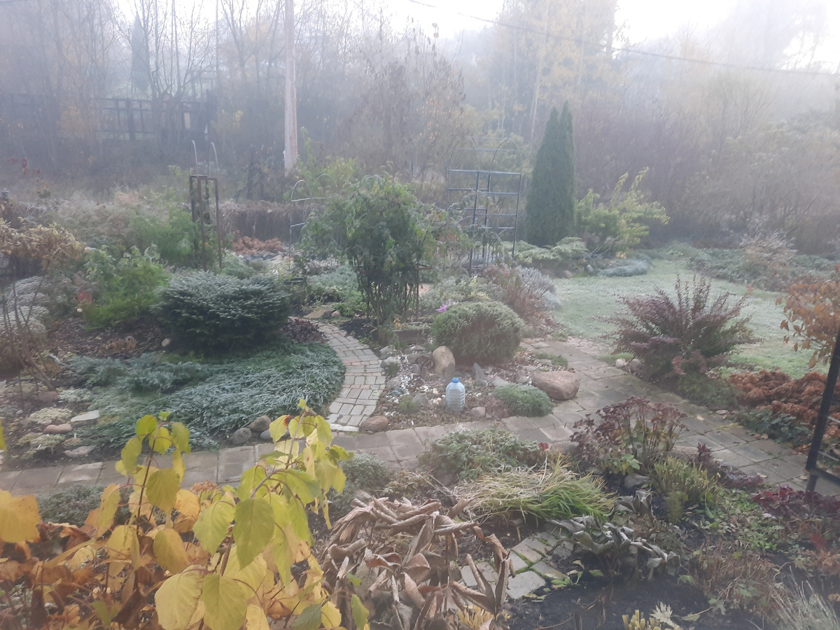 ВСЕМ ПРИВЕТ! Где-то уже зима аукает, где-то еще лето, а у нас осень гостит. Погода, как барышня с низкой социальной ответственностью, куролесит на все 100. Правды ради снега пока не было! И это отлично! Хоть +5 днем, дождь временами мелкий сыплет, потихоньку таки обрезала все, что хотела, даже розы уже ополовинила. Только стенку не сделала. Зашла дальняя соседка спросить про гортензии, а я не берусь сорт называть. Еще про розу спросила. Когда-то я им давала черенки от маминой розы. Так укоренилась, цветет! Приятная новость! Это все было сегодня, вчера за окном с утра было яркое солнце, туман и мороз. Выходить не хотелось. Я его из окна запечатлела. Так красиво было за окном, ярко, когда туман чуток разошелся по сторонам. Солнце теперь высоко не поднимается, так что не рано освещается лужайка. Хвойные совсем побелели! А ведь и времени не мало! Лень вставать было. Скоро все листочки осыплются, розы закутаю, и будем вместе дожидаться снега-мороза. Тую сегодня почистила, сколько дос