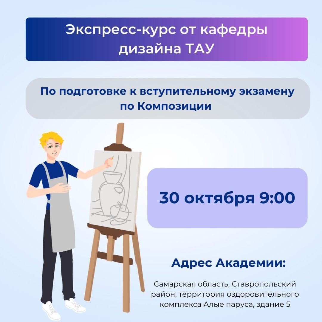 🎨30 октября Тольяттинская академия управления приглашает всех желающих (школьников 9-11 классов и учащихся колледжей) на экспресс-курс по подготовке к вступительному экзамену по Композиции от кафедры дизайна! Экспресс-курс — это небольшой проверочный демо-экзамен с быстрой обратной связью и корректировкой от преподавателя. 💥Курс бесплатный. 📝С собой иметь: — 2 листа ватмана формата А3; — 2 листа ватмана формата А2; — простой карандаш для построения; — ластик; — канцелярский нож; — гуашь; — кисти (белка или колонок) — №6 — 10; — тряпочка для кистей. 📋Регламент экспресс-курса: 09:30-12:15 Введение в работу над композицией 12:35-15:00 Работа над двумя композициями (по заданию вступительного экзамена) 📍Адрес: Самарская область, Ставропольский район, тер. Оздоровительный комплекс Алые Паруса, зд. 5, Аудитория С-402. 📎Доставка в Академию и обратно осуществляется корпоративными автобусами (график по ссылке: https://taom.academy/schedule).