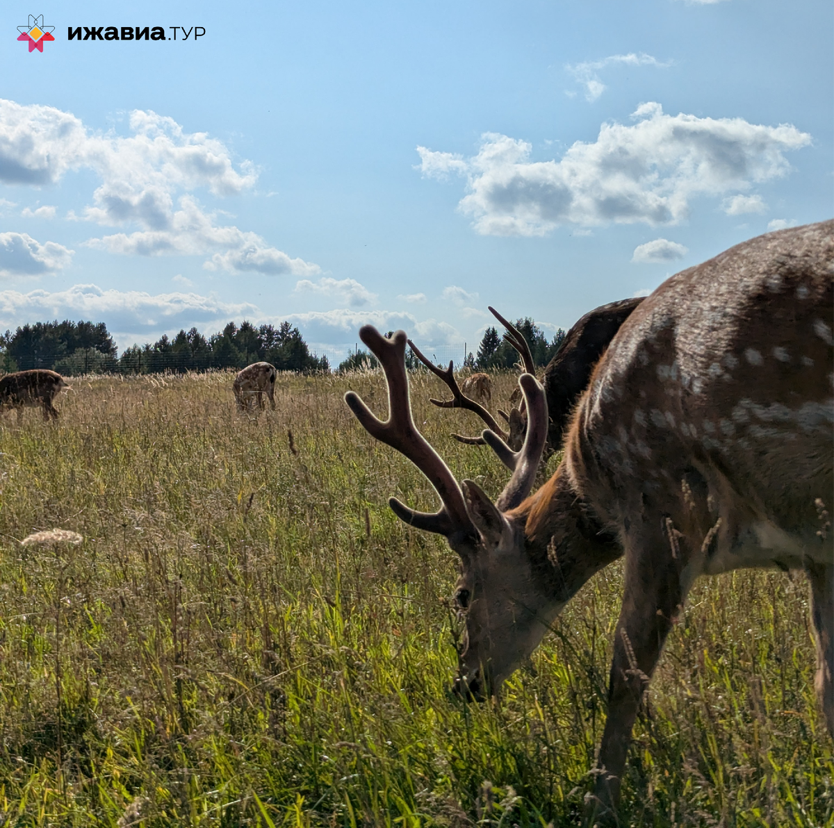 Олени для Удмуртии в диковинку, но совсем рядом со столицей республики есть место, где за этими зверями можно не только понаблюдать, но и тесно пообщаться - покормить и погладить. “Гринфилд парк” - отличное место для семейного отдыха с акцентом на воспитание бережного отношения к природе. Олени. Главная достопримечательность фермы – это олени двух видов: пятнистые и маралы. Пятнистые олени свободно гуляют по территории и охотно подходят к посетителям, позволяя их кормить. Маралы – крупные рогатые олени, более осторожные, но их также можно увидеть вблизи. Козы и овцы. На ферме много домашних животных, таких как низкорослые козы и барашки. Козы славятся своим дружелюбным и весьма бесцеремонным поведением: они не позволят, чтобы вы ушли не угостив их чем-то вкусным. Самоеды. Два больших белых мягких и пушистых самоеда встречают гостей на входе. Собаки очень добрые! Альпаки. На ферме есть несколько альпак, которые добавляют экзотики. Помните, что в их поведении есть характерные для вида ос