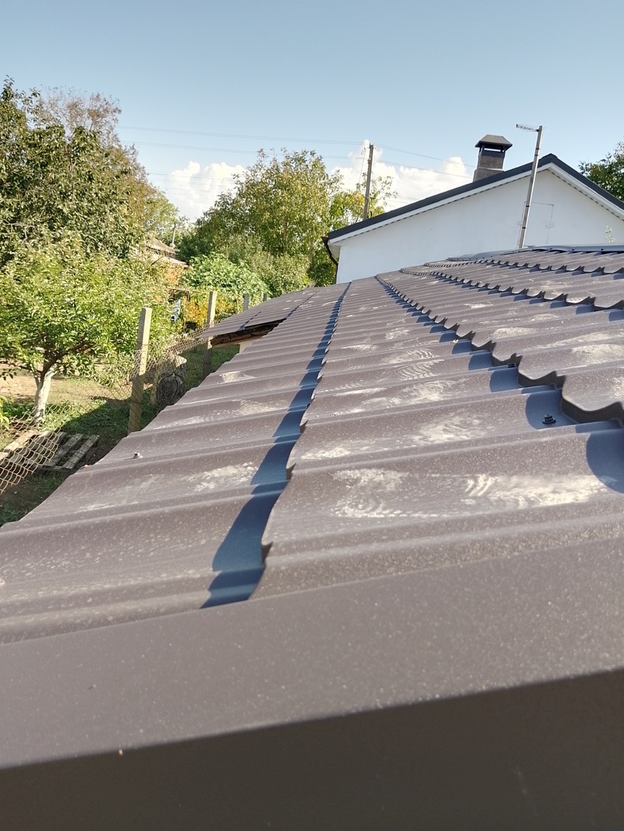 Здравствуйте! Ура, успели, погода позволила спокойно, без лишней суеты доделать крыши в Крымской глубинке. Один, не большой дождик не в счет. Два часа на попить чаю, и вперед. Зато теперь кровли на летней кухне готовы. Подпилил местами старые стропила, и поставил лобовую доску из остатков террасной доски. По цвету и по стилю как раз подходит и к настилу и к перголе. Думал придется труднее. Слишком уж все не ровное, но нет легла ровненько и к месту. Еще бы чуть лучше геометрия бы была, было бы здорово. А теперь придется что то думать. Один столб перголы мешает установить водосточную систему. Еще одна задача. Ну да ладно, какое то решение придет. Доделал кровлю на летней кухне, сразу же переключился на кровлю гаража. Эту крышу ниоткуда не видно, так что решили просто шифер убрать, посмотреть состояние стропил и обрешетки, и постелить профлист. Не смотря на кучу мусора на крыше, шифер довольно таки живой, весь сняли вдвоем с заказчиком, даже не сломав. Под ним сплошная обреше
