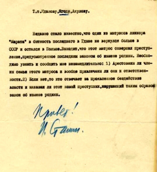 Шел 1934 год. Советский линкор «Марат» пристал пристал к берегам Польши. На причал города Гдыня сошли матросы линкора. После возвращения на корабль оказалось, что кочегар Сергей Воронков не вернулся и скрылся в польском городе. По возвращению на родину о инциденте доложили товарищу Сталину. Тот придя в ярость приказал найти матроса и арестовать. А для пущей верности заочно приговорить его к расстрелу. А пока беглого матроса ищут, необходимо арестовать всех матросов-кочегаров, а их семьи сослать в лагеря как изменников. Как ко мне попала эта информация? Да почитал я тут либеральных авторов, открывших мне глаза на деятельность И.В. Сталина. Вот оказывается он какой, «кровавый палач» да и только. И доказательство этому есть, вот записка, подписанная лично им. Хранилась она, а точнее ее фотокопия, в фонде Яковлева. Дабы не ломать глаза вчитываясь в фото, привожу текст записки целиком: Товарищам Жданову, Ягоде, Акулову. Недавно стало известно, что один из матросов линкора «Марата» в бытност