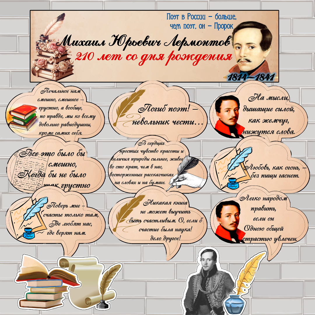 1. Плакат для печати на принтере (5 листов А4) и для широкоформатной печати (100х29 см). Эти плакаты не только украсят ваше пространство, но и напомнят о величии творчества Лермонтова.