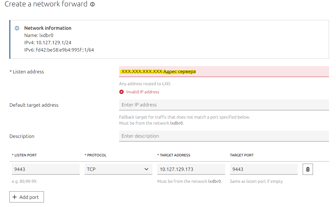 Для реализации идеи, мне потребуется ZTNET и Fastpanel. ZTNET будет объединять локальные сети, и через Fastpanel выводить нужные мне сервисы в интернет. Качаем файл yaml для установки ZTNET. Чуть не забыл, наш докер и его приложения, находятся за "забором", поэтому надо пробросить нужный порт "9443" для работы с Portainer. В свойствах контейнера указано, что он подключен через бридж lxdbr0, вот его и будем строить. Выбираем вкладку Networks и в ней lxdbr0. Проходим по ссылке Forwards и вот здесь мы настроим проброс порта. Жмем Create forward Контейнер в локальной сети имеет адрес - 10.127.129.173. В свою очередь, наш контейнер является хостом для докера, а в настройках установочного скрипта Portainer было указано пробросить порт 9443 на хост. Из этого делаем вывод, что порт уже активен на IP хоста. Пробрасывать будем c 10.127.129.173 на IP нашего сервера который смотрит в мир. Вводим наши данные и сохраняем - Пробуем подключиться к панели управления от Portainer https://IP:9443 - И е