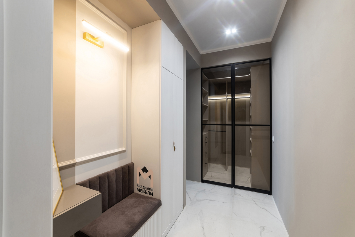 Марии Реутовой Небольшая, но уютная прихожая выполнена из таких материалов, как: корпус EGGER "Белый премиум" и "Кубанит серый", фасады МДФ "Белый софт" с фрезеровкой "БРИЗ". Комбинация гладких и рельефных 3D фасадов с вертикальными полосами идеально дополняют сочетание оттенков фасадов. Использование фактурных материалов и изящных ручек — простой и эффективный способ придать интерьеру "изюминку". При входе расположили небольшую тумбу, рядом — мягкое сидение с обувницей. Здесь удобно переодевать обувь и положить сумки, ключи. Небольшой шкаф позволит решить проблему с хранением верхней одежды и аксессуаров. Гардеробная — мечта многих женщин. В данном проекте мы установили ее в вместительной нише. В ней разместили разнообразную систему хранения. Слева расположены открытые полки под одежду и выдвижные ящики. Справа - стеллаж. Пр
