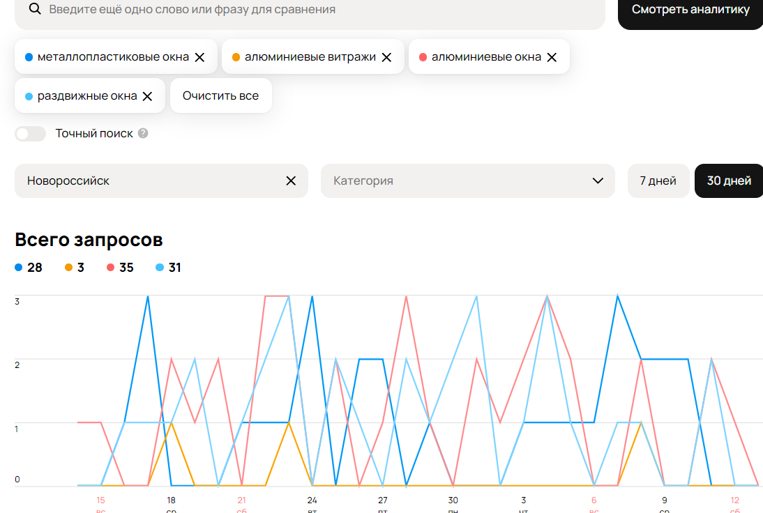 При анализе спроса на алюминиевые системы остекления на Авито, команда Timura.ru обнаружили, что суммарный объем запросов составляет 100 в месяц, а число звонков и сообщений — всего 29. Такая ситуация требует особого подхода к продвижению, где ключевая цель — охватить максимум с минимальными затратами. Необходимо закрыть все запросы, даже самые мелкие. Для этого: Не стоит тратить много денег на рекламу при ограниченном спросе. Вложите минимальные средства: Если невозможно получить все звонки, достаточно одного объявления с хорошим описанием. Оно должно быть оптимизировано под запросы, после чего можно просто поддерживать активность аккаунта. Этот подход позволяет минимизировать расходы и получить максимум от маленького рынка.