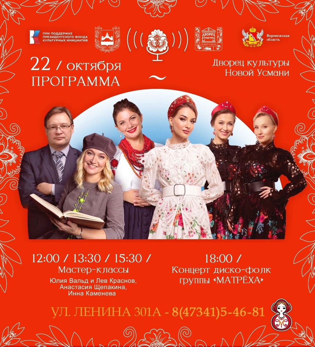 Добрый день, дорогие друзья! У нас для вас отличная новость! 22 октября во Дворце культуры пройдет ряд увлекательных мероприятий, которые подарят вам незабываемые впечатления и возможность погрузиться в мир творчества и музыки. Программа мероприятий 22 октября: Лекторы: Юлия Вальд и Лев Краснов Начнем день с глубокого погружения в тему самореализации и развития личного потенциала. Это будет уникальная возможность получить советы от экспертов и задать вопросы, которые вас интересуют. Лектор: Анастасия Щепакина Продолжим программу с Анастасией Щепакиной. Она расскажет о том, как народная музыка может быть актуальна в современном мире. Вы узнаете, как традиционные мелодии переплетаются с современными музыкальными направлениями и как сохранить их уникальность, адаптируя к новым реалиям. Лектор: СПЕЦ.ГОСТЬ В третьем мастер-классе мы встретимся с специальным гостем, который раскроет нам тайны глубины русской песни. Это будет уникальная возможность узнать о богатстве и многообрази