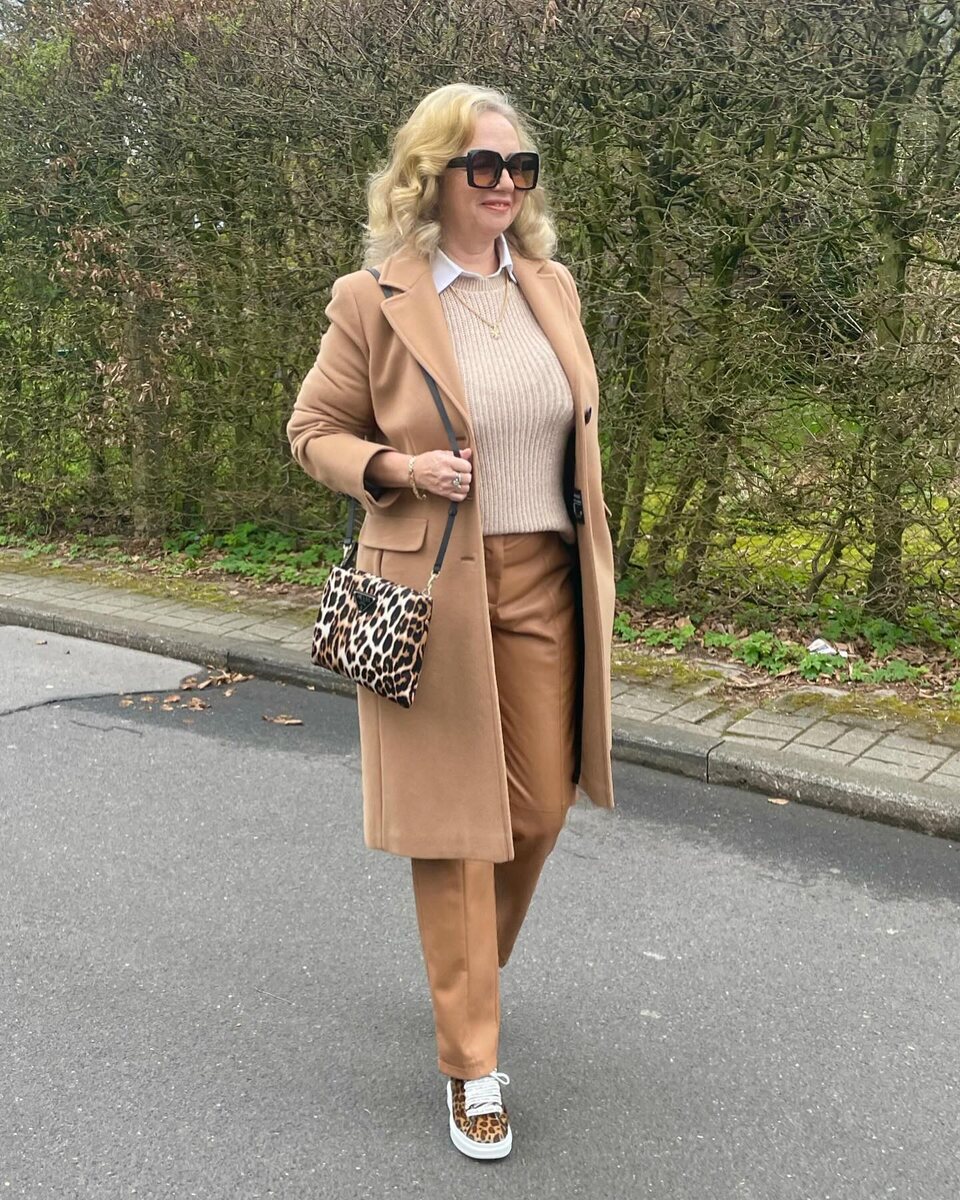 Для текущего сезона характерны теплые цвета, чаще всего модницы носят одежду в бежевых тонах. Соедините в одном комплекте классическую рубашку, джемпер, брюки из матовой кожи, леопардовые кеды, кросс-боди и многослойный сет готов!