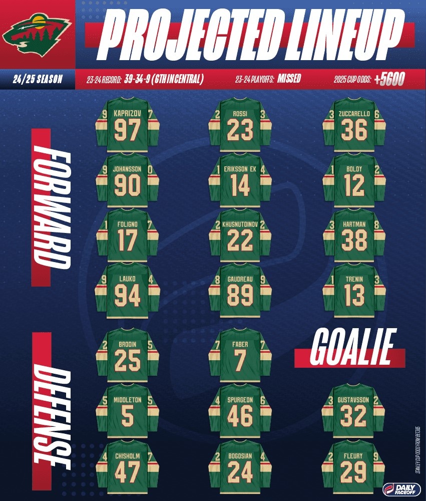 Нападение зависит от Кирилла Капризова, а также от 23-летнего Мэттью Болди, два сезона подряд выбивающего 60+ пойнтов и действующего на обоих флангах атаки. Матсу Зуккарелло, самому выдающемуся норвежцу в истории НХЛ, исполнилось 37, но он играет с огромным желанием: те же 60+ очков на протяжении трех сезонов подряд.