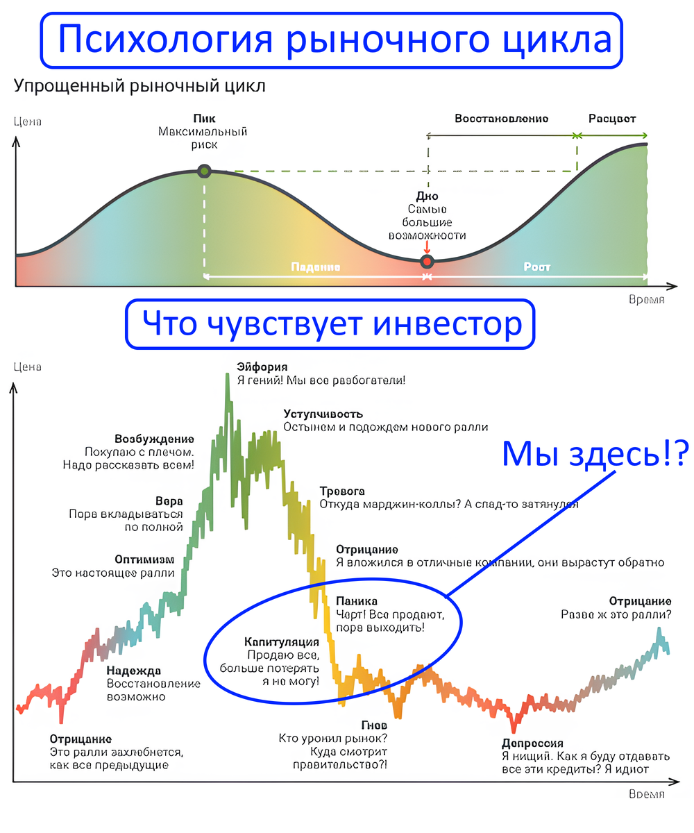 Сейчас рынок снижается, он находится в цикле рецессии. А если ориентироваться на график эмоций, сейчас идёт "Паника" (Чёрт, все продают, пора выходить из акций) или "Капитуляция" (Больше не могу терять деньги, избавляюсь от акций).