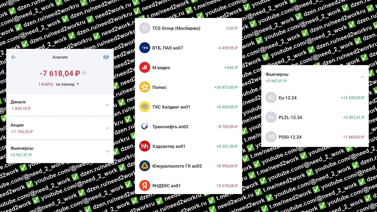 Сколько я потерял за торговую неделю с 21 по 25 октября 2024 года? Общая отрицательная доходность моего спекулятивного портфеля составила -7 618 рублей. При этом денежный убыток составил 1 845 рублей — это комиссии за плечо и за сделки. Следует напомнить, что на прошлой неделе было принято решение о повышении ключевой ставки до 21%. Это событие я не шортил, потому что не верил, что ставка будет настолько высокой, к тому же индекс дёргался то вниз, то вверх в надежде выбить шортистов, но, видимо, нужно было перестраховаться. Акции принесли убыток около 11 740 рублей. Самой доходной акцией был «Полюс», и одновременно самый большой убыток принёс другой золотодобытчик — «ЮГК». Также падал «Яндекс». Фьючерсы принесли доход в районе 6 000 рублей. Очень хорошо получилось заработать на фьючерсе на евро, а также удалось заработать на бэквордации фьючерса акции «Полюс» к базовому активу за счёт того, что дивиденды ещё не были учтены в разнице цен. Интересно, подпишись https://t.me/need2work