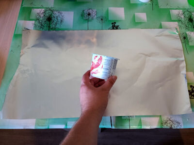 Изготовить интересно выглядящую свечу можно без специальной литьевой формы, воспользовавшись простым приёмом, о котором рассказано ниже. 1. Берём лист пищевой фольги подходящего размера и какую-нибудь ёмкость – в данном случае была взята пластиковая баночка от покупной закуски. Также я рекомендую использовать по возможности как можно более толстую фольгу в силу её большей прочности на разрыв. 2. Комкаем фольгу и оборачиваем ей ёмкость так, чтобы она образовала подобие стакана. 3. Убираем ёмкость и получаем заливочную форму. 4. Аккуратно проделываем в центре донной части формы отверстие, просовываем в него конец фитиля и фиксируем его с внешней стороны кусочком малярного скотча. Другой конец фитиля располагаем вертикально при помощи палочки. 5. Заливаем внутрь растопленную свечную массу и оставляем её застывать. Она, как это видно на фото, немного протекла (через отверстие для фитиля). После охлаждения оставалось лишь снять фольгу и срезать лишнюю часть фитиля. Готовая свеча выглядел