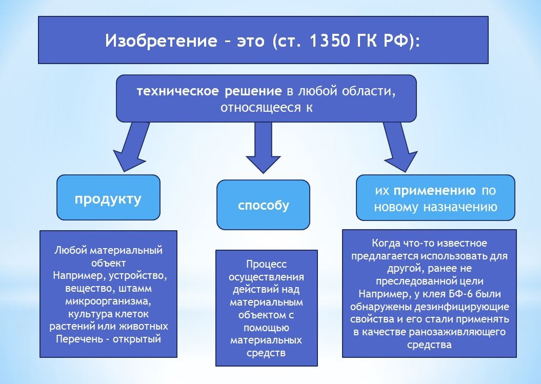 📌 Итак, изобретение это решение, определенная мысль в любой сфере деятельности человека, которая относится к продукту или способу.
