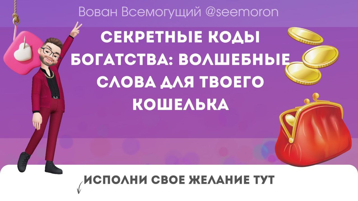 Привет, мои феюшки и волшебницы! Сегодня я, Вован Всемогущий, расскажу вам о тайных кодах, которые напрямую влияют на наше подсознание и притягивают богатство! Ну что, готовы расширять финансовый поток? Давайте разбираться. Подпишись на мой телеграм, там много новых практик, которых тут нет Представьте, что ваш мозг — это компьютер, а эти слова — пароли к вашему подсознанию. Вводите их — и готово, финансовый поток начинает расширяться, богатство притягивается. Давайте по порядку: 1. "ВМЕСТЕ" — Это слово объединяет все ресурсы вашего организма и энергии вокруг для привлечения финансов. Когда вы говорите "вместе", Вселенная понимает: ага, пора собирать усилия в кучу и притягивать деньги. Однажды ко мне пришла волшебница Ольга. Она говорит: "Вован, как так, я все делаю, но денег нет!" Я ей: "А ты пробовала говорить 'вместе'?" Спустя неделю Оля возвращается с улыбкой: "Слушай, я стала везде говорить это слово, и клиенты буквально посыпались!" Вот так феечки, слово — волшебное. 2. "ПОЛУЧАЕ