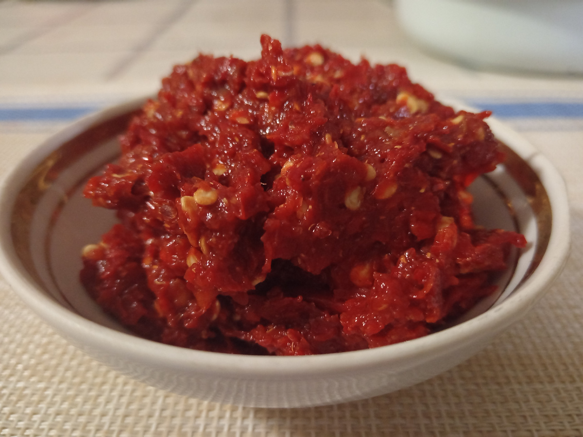 Перец и чеснок перекрутить в мясорубке, приправы смолоть в кофемолке. Все соединяем, смешиваем с томатной пастой, Добавим соль 2 ст. ложки и сахар 1 ст. ложку. Все перемешаем...