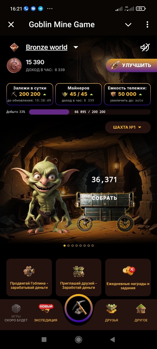 Познакомимся с новой игрой Goblin Mine Game, рассмотрим её фишки и чем она может заинтересовать. Сразу напишу, что тут не нужно долбить всеми пальцами по своему телефону (это не тапалка), не нужно искать каждый день на сайтах карточки и ежедневный шифр азбуки Морзе и вбивать его по несколько раз, слетая на последней букве...Никаких вложений тут также нет. Ссылка на игру На главной странице мы видим наш доход и инструменты для его повышения- персонал(майнеры), залежи (сколько максимум можно собрать с шахты, емкость тележки. Прокачивая эти вкладки, мы увеличиваем наш доход. Ежедневные задания ограничиваются несколькими подписками в соц.сети, затем просто каждый день забираем монеты. Насчет экспедиций, вы можете инвестировать(другого слова на ум не пришло) свои монеты на разные сроки, и чем больше срок, тем больше проценты, но на маленьких сроках можно и потерять свои монеты, скрин ниже. Прокачиваем шахту и что видим дальше. Этих шахт аж 8 штук, каждая будет открываться всё дороже и д