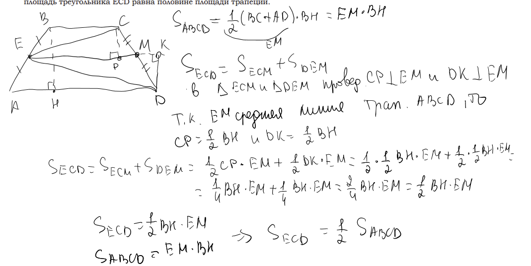 24 задание Точка E – середина боковой стороны AB трапеции ABCD. Докажите, что площадь треугольника ECD равна половине площади трапеции. Все решения выполнены человеком. В случае обнаружения вычислительных ошибок, просьба отметить этот недочёт в комментариях.