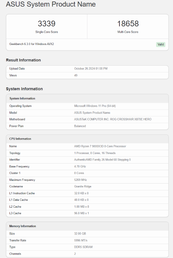 AMD Ryzen 7 9800X3D с 3D V-Cache выйдет уже менее чем через две недели. Сегодня в сети появился еще один бенчмарк ЦП, который показывает его чистую мощь. Процессор был протестирован в нескольких программах, и это второй результат Geekbench для ЦП, который показывает, насколько далеко продвинулись процессоры с технологией X3D с точки зрения чистой производительности. Чип был протестирован в Geekbench 6.3 с использованием материнской платы ASUS ROG Crosshair X870E Hero с включенным PBO, увеличив стандартную тактовую частоту процессора до 5,27 ГГц, что позволило ему набрать впечатляющие 3339 баллов в одноядерных и 18658 баллов в многоядерных тестах, превзойдя предшественника предыдущего поколения на 25%. Два дня назад процессор был протестирован в Geekbench и набрал 3305 баллов в одноядерных и 18221 балл в многоядерных тестах. Таким образом последние результаты немного улучшились. Хотя результаты Geekbench различаются от теста к тесту, видно, что оценки большинства Ryzen 7 7800X3D колеблю