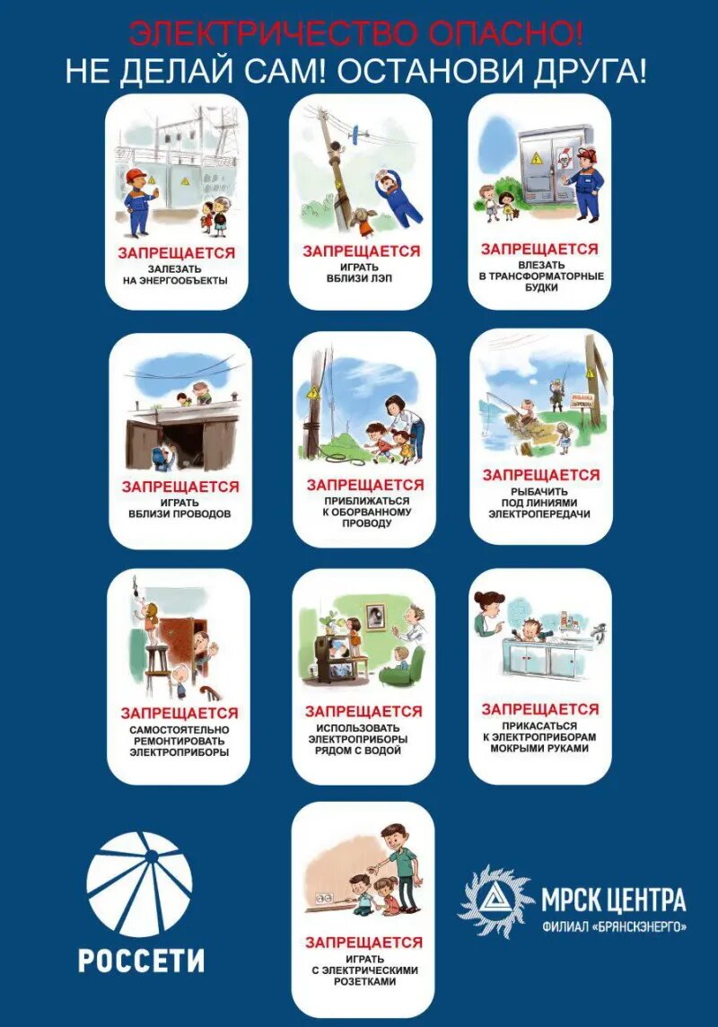 Филиал ПАО «Россети Центр» − «Брянскэнерго» и ООО «Брянскэлектро» во время школьных каникул – времени, когда дети нередко находятся без присмотра взрослых, напоминают ребятам о необходимости правил электробезопасности. Иллюстрация предоставлена «Брянскэнерго» Десять «НЕ» детям: НЕ играйте рядом с линиями электропередачи. НЕ разжигайте костры под линиями электропередачи, не складывайте рядом дрова, солому и другие легковоспламеняющиеся предметы. НЕ открывайте двери ограждения электроустановок, не перелезайте за ограждения и барьеры. НЕ заходите на территорию и в помещения электросетевых сооружений. НЕ влезайте на опоры линий электропередачи, не проникайте в трансформаторные подстанции или подвалы, где находятся электрические провода. НЕ набрасывайте на провода проволоку и другие предметы, не разбивайте изоляторы. НЕ снимайте предупредительные знаки и плакаты с энергообъектов – тем самым вы подвергайте опасности жизнь других людей. НЕ открывайте лестничные электрощиты и вводные щиты, нах