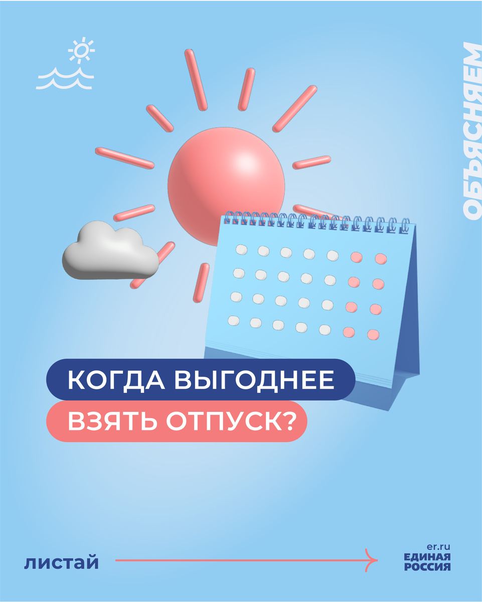Сейчас самое время планировать отдых! До середины декабря работодатели утверждают график отпусков на следующий год. Собрали для вас информацию о том, когда выгоднее взять отпуск и почему. Листайте наши карточки.