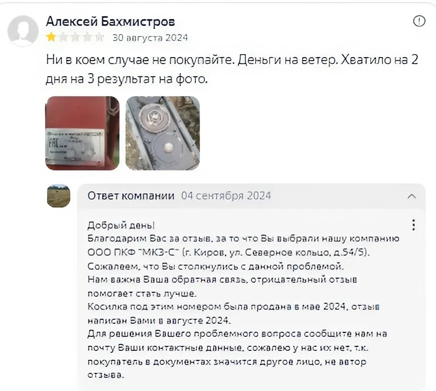В отзыве сообщается, что косилка проработала всего два дня, на третий день сломалась. К отзыву были приложены фотографии шильдика косилки с заводским номером и шестерней бруса режущего с обломанными зубьями. На фотографии шильдика видно, что косилка была произведена в апреле 2024 года, а негативный отзыв опубликован в сентябре 2024 года. Это значит, что гарантийный срок эксплуатации этой косилки заканчивается в апреле 2025 года. Покупателем роторной косилки является другой человек, не автор отзыва (это есть в наших документах). Кроме того, по вопросу гарантийного ремонта косилки ротационной навесной КРН 2,1 с номером 2358 в сервисную службу ПКФ «МКЗ-С» обращений не поступало. Очень хочется взглянуть на эту косилку и разобрат