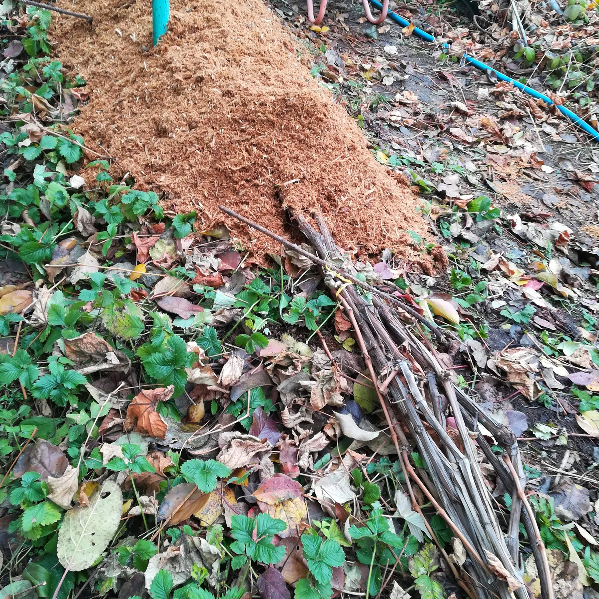 Обрезанную, связанную и пришпиленную к почве лозу засыпаю свежими опилками.