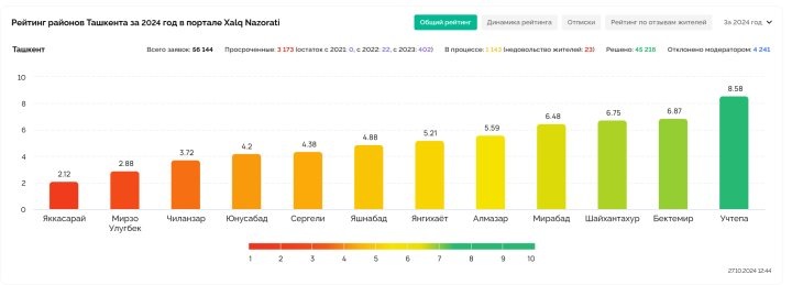 Наиболее эффективно, согласно данным портала, с обращениями граждан работают в Учтепинском районе Ташкента. Его рейтинг составил 8,58 баллов. Наименьшее количество баллов (2,12) получил Яккасарайский район, заняв последнее место в рейтинге.
