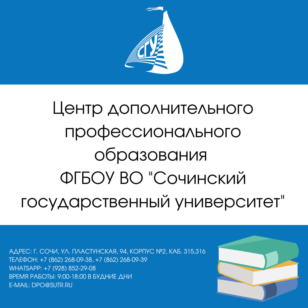ФГБОУ ВО «Сочинский государственный университет» объявляет о продлении приема документов до 10 ноября 2024 года на подготовительное отделение для отдельных категорий граждан: При подаче заявления о приеме поступающий представляет: Контакты: по адресу: Сочи, улица Пластунская, д.94, к. 316/2, будние дни с 9:00 до 17:00. Электронная почта: dpo@sutr.ru Телефон: +7(862) 268-09-38, +7 (928) 852-29-08