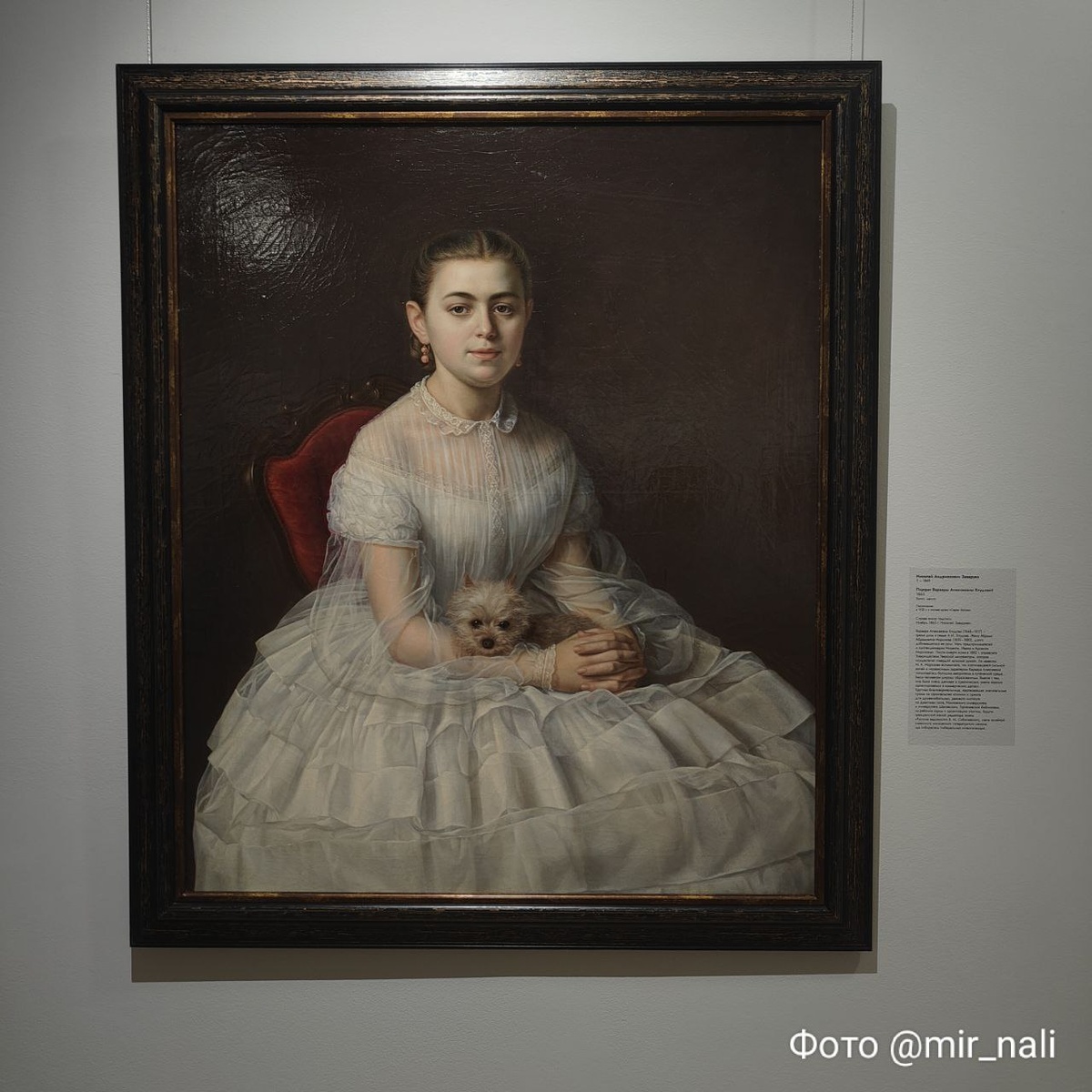 Как раз в этом музее я встретила потрясающий портрет Варвары Алексеевны Хлудовой, созданный художником Николаем Андриановичем Заваруевым. На картине изображена молодая девушка с милейшей собачкой на коленях, а каждый штрих так тщательно проработан, что кажется, будто всё вокруг совершенно живое. Варвара Алексеевна была третьей дочерью московского предпринимателя А.И. Хлудова и стала супругой Абрама Абрамовича Морозова, известного текстильного фабриканта и совладельца «Товарищества Тверской мануфактуры». Долгое время она противилась этому браку, но в конце концов согласилась, желая примирить своего отца с братом, Михаилом Алексеевичем Хлудовым. Взгляд на её жизнь и деятельность впечатляет. Пройдя через тяжёлые испытания, Варвара активно занималась благотворительностью. Овдовев в 1882 году, она основала Психиатрическую клинику им. А.А. Морозова при Императорском университете, а затем и клинику нервных болезней. В 1903 году её усилия помогли создать Институт им. Морозовых — первый в Росси