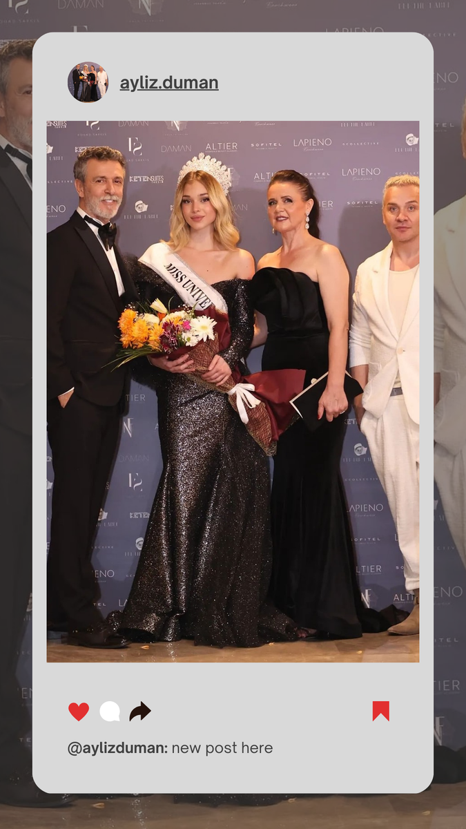 Айлиз Думан: «Участие в конкурсе «Мисс Вселенная 2024» - это не только честь представлять страну, но и возможность поделиться своими идеями на международной арене... Приглашаю всех в Мексику, чтобы прочувствовать вместе со мной каждый миг невероятного путешествия красоты и силы духа. Вас ждет незабываемое шоу, в рамках которого каждая участница проявит себя как в ошеломляющем дефиле, так и инновационных испытаниях, акцентирующих способность к лидерству и социальному влиянию... У меня же есть все необходимое для финального вечера, который состоится 16 ноября в Мехико. До встречи. Ваша Айлиз».