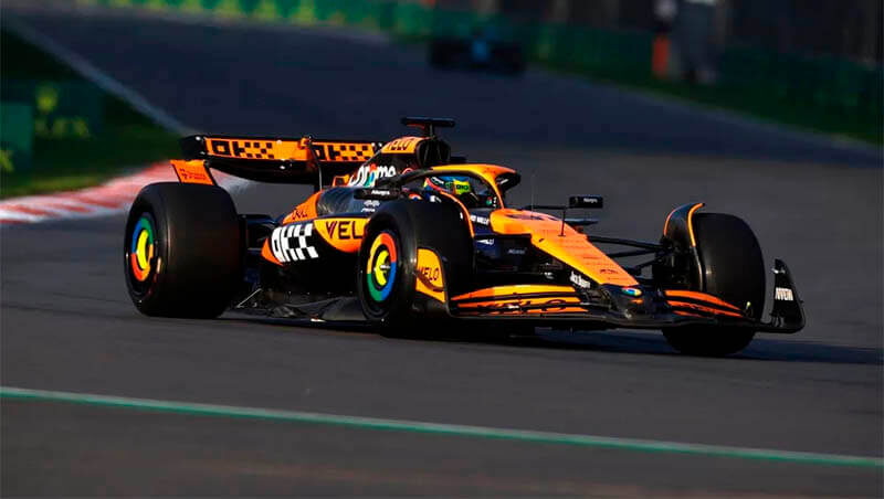 Оскар Пиастри завершил последнюю тренировку перед Гран-при Мексики на первом месте в протоколе, опередив своего напарника по команде «McLaren» Ландо Норриса на 0,059 секунды в Формуле-1. Два гонщика «McLaren» опережали остальных участников пелотона примерно на три десятых секунды во главе с лидером ранней сессии Карлосом Сайнсом, поскольку гонщик «Ferrari» не смог извлечь выгоду из своего темпа в первой половине сессии. Поскольку вторая тренировка использовался в качестве теста шин Pirelli, гонщики потратили первые круги на получение опыта езды на мягких и средних шинах. Макс Ферстаппен установил первый круг на мягких шинах прямо с самого старта, пытаясь компенсировать ограниченный пробег в пятницу; силовой агрегат голландца был заменен, чтобы устранить утечку, которая преследовала его вчера. Он задал темп с результатом 1.18,397, но его быстро побили. Джордж Рассел, еще один гонщик, восстанавливающийся после пятничных неудач, когда во второй тренировке ему пришлось менять шасси, показа