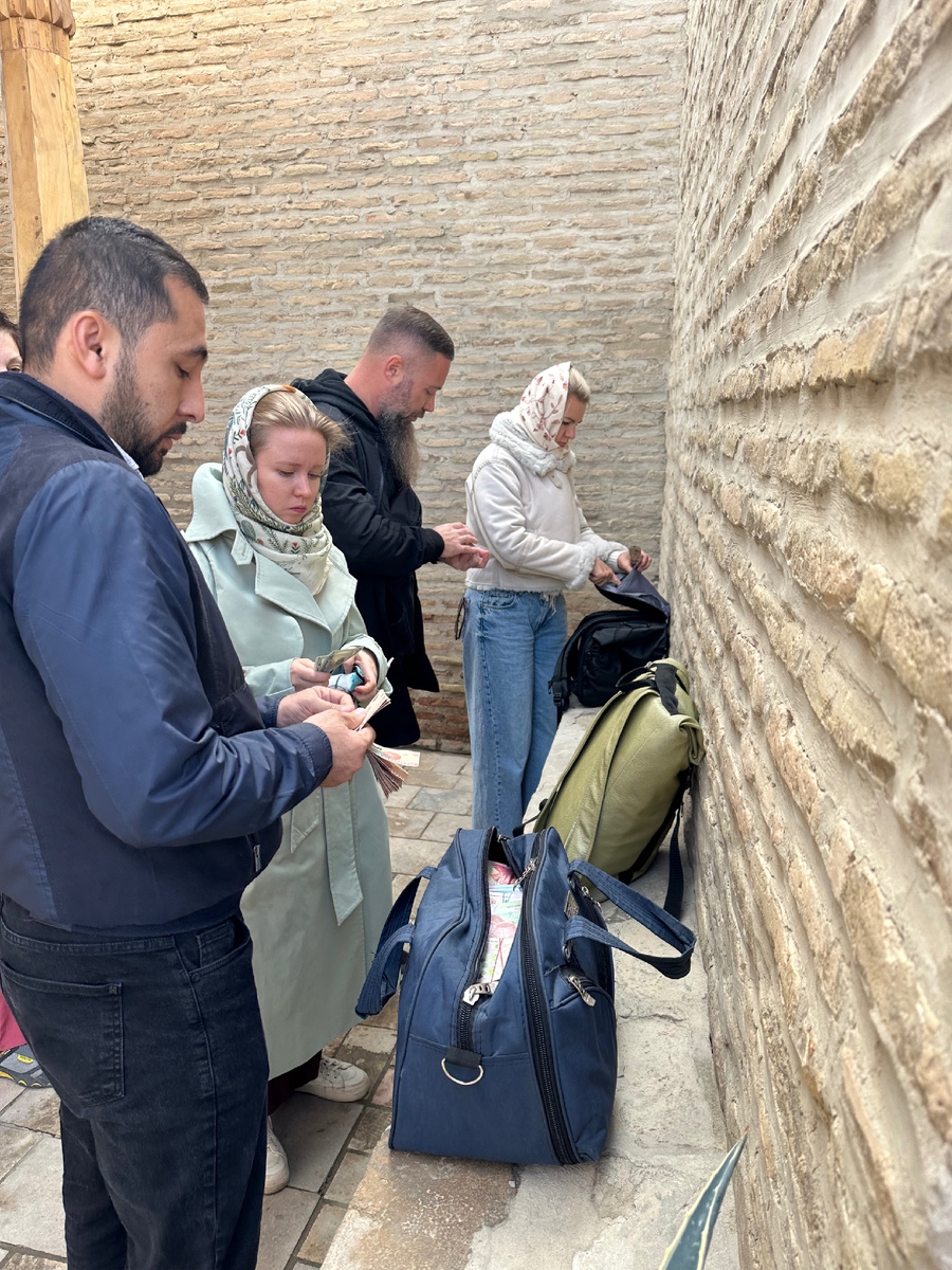 Есть два способа: в банках и у менял. Мы использовали второй. В Узбекистан лучше ехать с долларами, чтобы была возможность поменять на местную валюту (Сум) по самому выгодному курсу. В банках курс менее выгоден, чем на улице. К тому же многие банки не работают в выходные. Менял можно встретить где угодно, попросить посоветовать такого «банкира» у гида или в своем отеле. И обязательно, как на любом восточном базаре, нужно поторговаться, выторговать еще более лучший для себя курс. В этой сумке на видео у менялы местные сумы целыми пачками, он с ними приходит на встречу и сразу же отсчитывает вам «котлеты» денег в обмен на ваши скромные доллары. В Узбекистане вы всегда будете миллионером. Не долго, но будете.